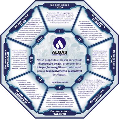 A companhia expressa sua identidade organizacional por meio de um Ba Guá, onde ao centro se destaca o Propósito da ALGÁS e ao redor os Princípios de Gestão.